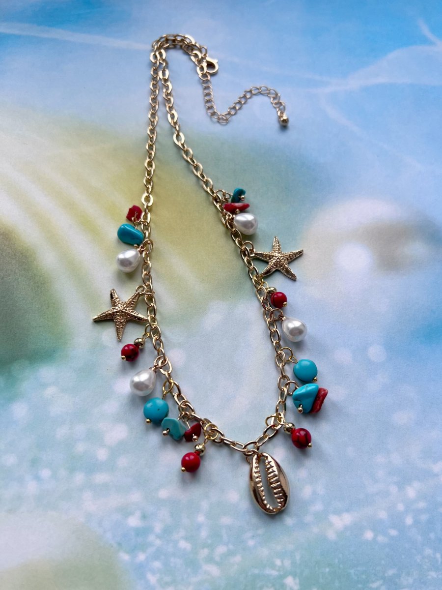 Zlatý přívěskový náhrdelník - perly, hvězdice, mušle, kamínky, tyrkenitky - přívěsky na hrubším zlatém řetízku (řetízek a kovové komponenty běžný kov). Délka 47 cm + prodlužující řetízek 8 cm, zapínání karabinka.