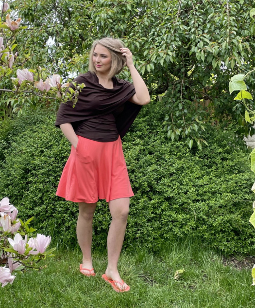 Rozšířená sukně je ušitá z pružného úpletu viskóza /elastan . V bočních švech jsou kapsy.