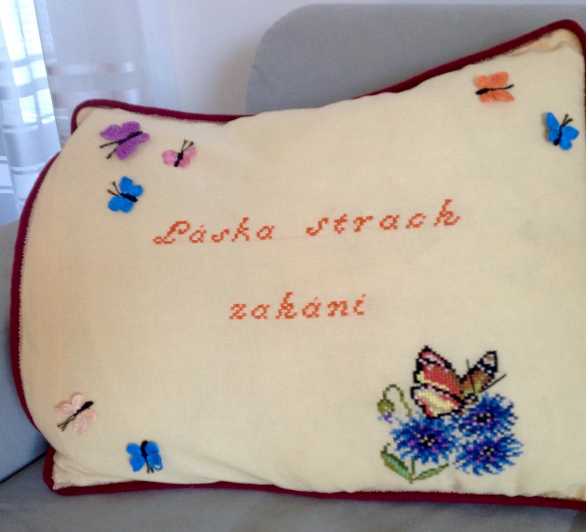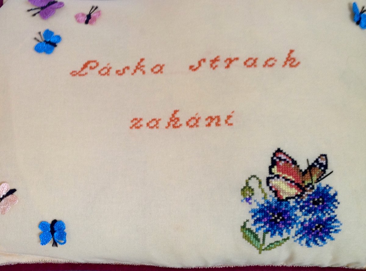 Povlak na polštář je ozdobený vyšitvkou na bavlněné perličce a je doplněný, háčkovanými motýlky. Okraj je ozdoben dutinkou. Zapínání ja na suchý zip. Rozměry; 53 x 44 cm