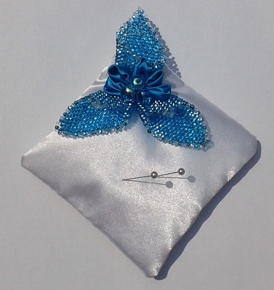 Bílý saténový polštářek pod snubní prstýnky ozdoben tyrkysovým korálkovým květem a tyrkysovým saténem. Velikost 10 x 10 cm. Součástí jsou i špendlíky s bílou hlavičkou.