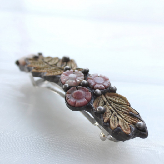 Vlasová spona přírodního vzhledu je vyrobena technikou tiffany (cínování) z mnou zhotovených keramických střepů a z krásně vyřezávaných rodonitových kytiček. Mechanika spony (franc.spona) je dlouhá 8cm. Celkově má spona rozměry 10,1 x 2,8cm. Patinováno, ošetřeno antioxidantem.