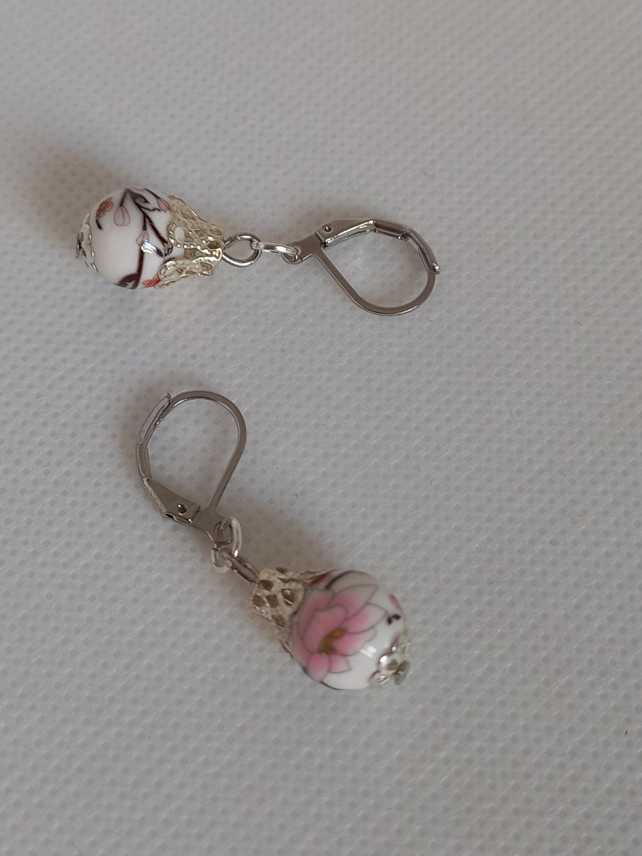 Ketlované náušnice s porcelánovým korálkem, na kterém jsou motivy růžových kytiček. Se stříbrnými komponenty působí jemně.