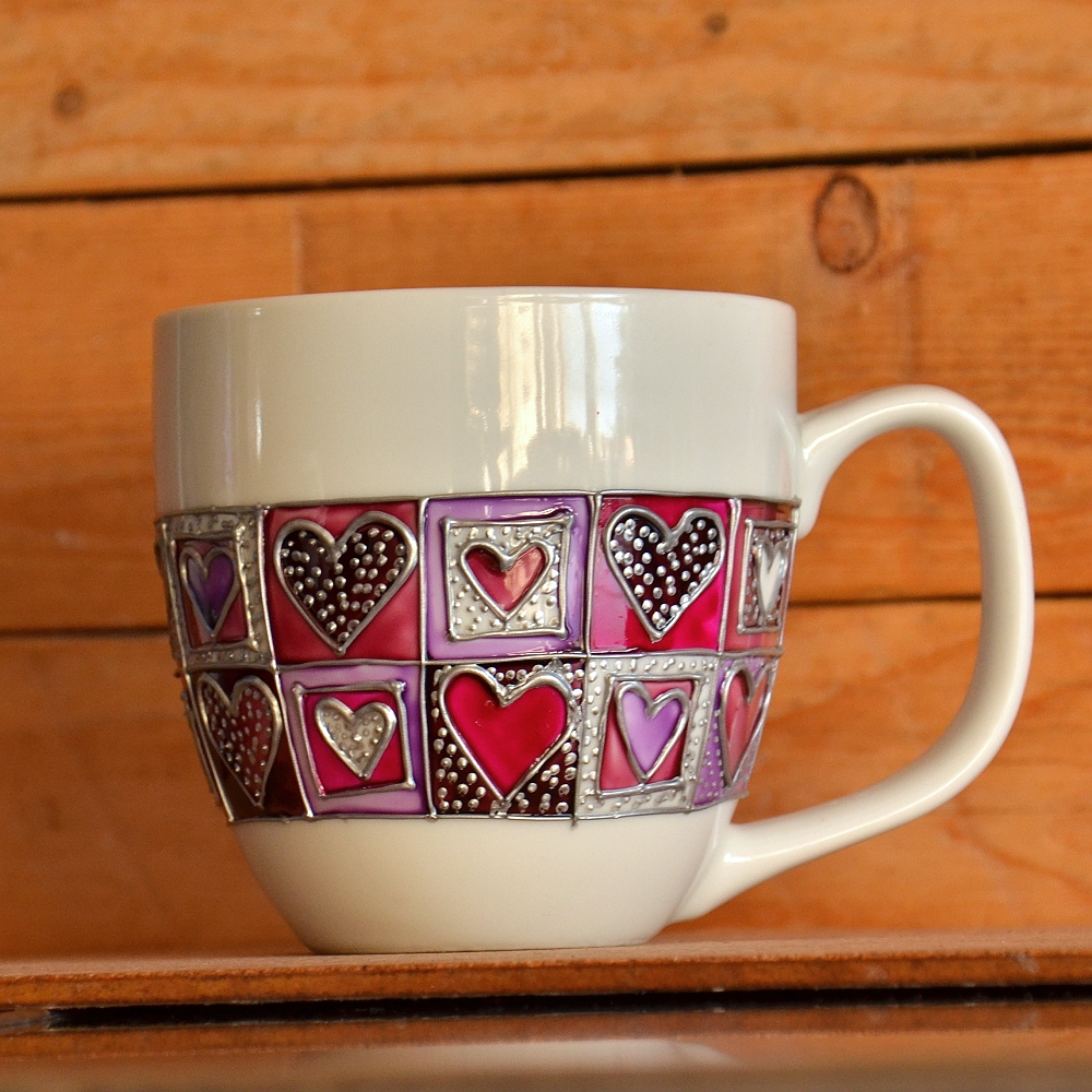 Ručně dekorovaný porcelánový hrnek Jim s fialovým patchworkovým srdíčkovým vzorem. Barvy jsou lemované stříbrnou plastickou konturou.