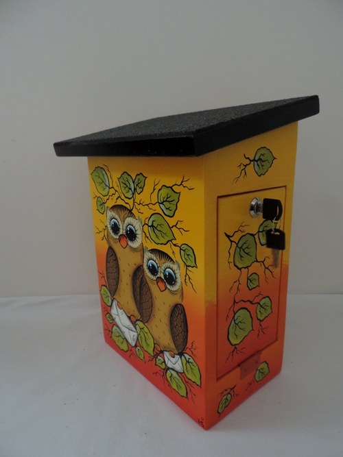 Originální krásná dřevěná zamykatelná poštovní schránka(v-38,š-28,h-16,síla1,8cm) vházení pošty z vrchu a otevírání z boku, napuštěno proti plísni,malované akrylovými voděodolnými venkovními barvami,přelakované lodním lakem.