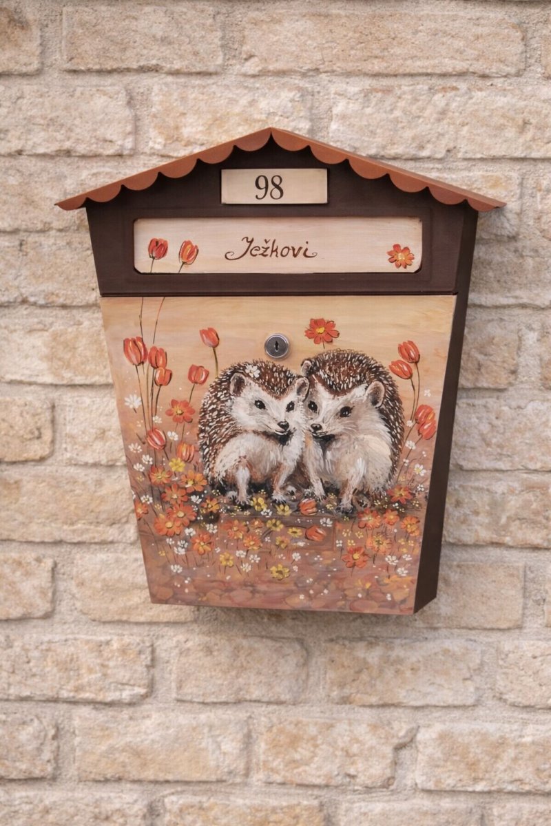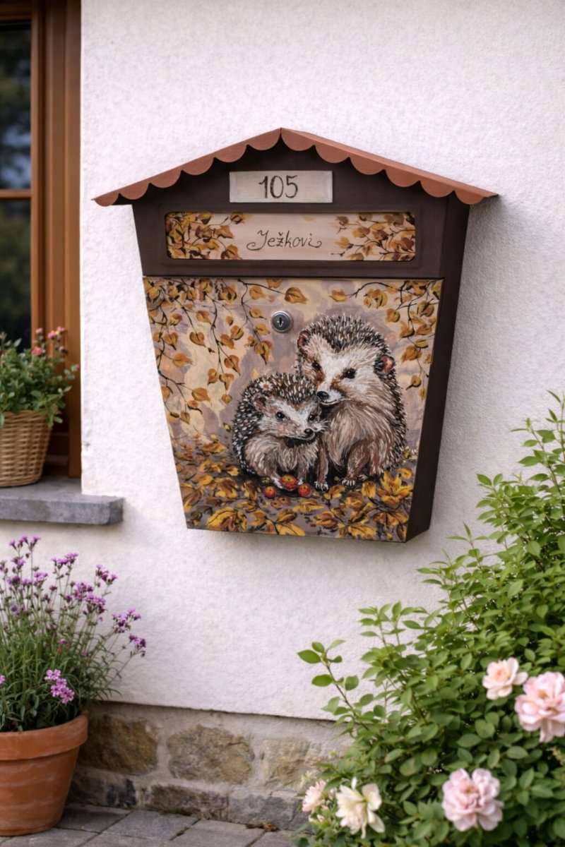 Originální ručně malovaná poštovní schránka s motivem dvou ježečků obklopených podzimními květy vnese k vašemu domu pocit tepla, pohody a blízkosti přírody. Jemné podzimní barvy, listí a květiny vytvářejí harmonickou kompozici, která krásně ladí s fasádou domu i okolní zahradou.