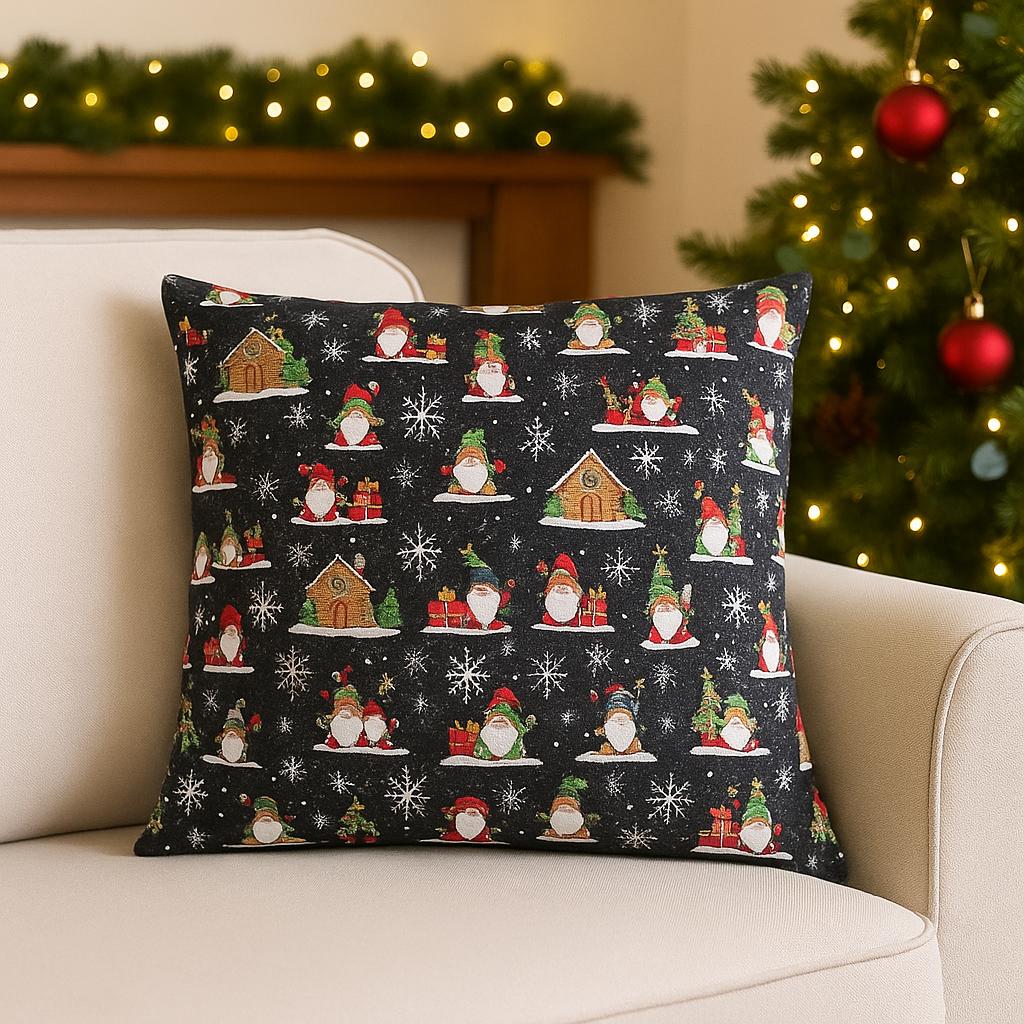 Připravte svůj domov na kouzlo Vánoc. Černá látka s motivem vánočních trpaslíků a zasněžených chaloupek působí hravě, ale přitom elegantně.