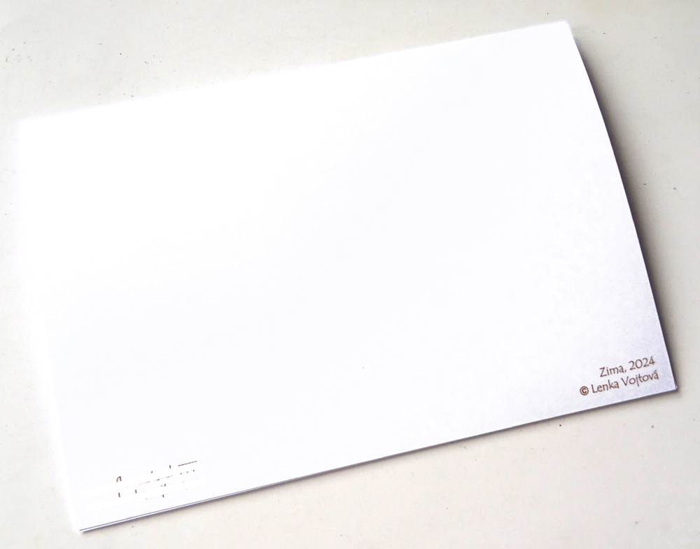 Tištěno na papír s gramáží 300gm2. Rozměr 13,5 x 19,5 cm, dvojitá, otevírací karta, uvnitř čistá. Dodáváno s obálkou.