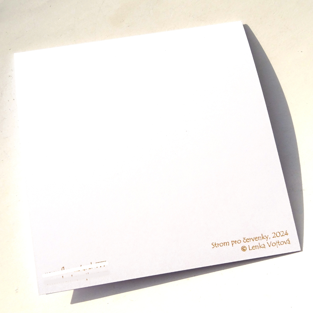 Tištěno na papír s gramáží 300gm2. Rozměr 13 x 13 cm, dvojitá, otevírací karta, uvnitř čistá. Dodáváno s obálkou.