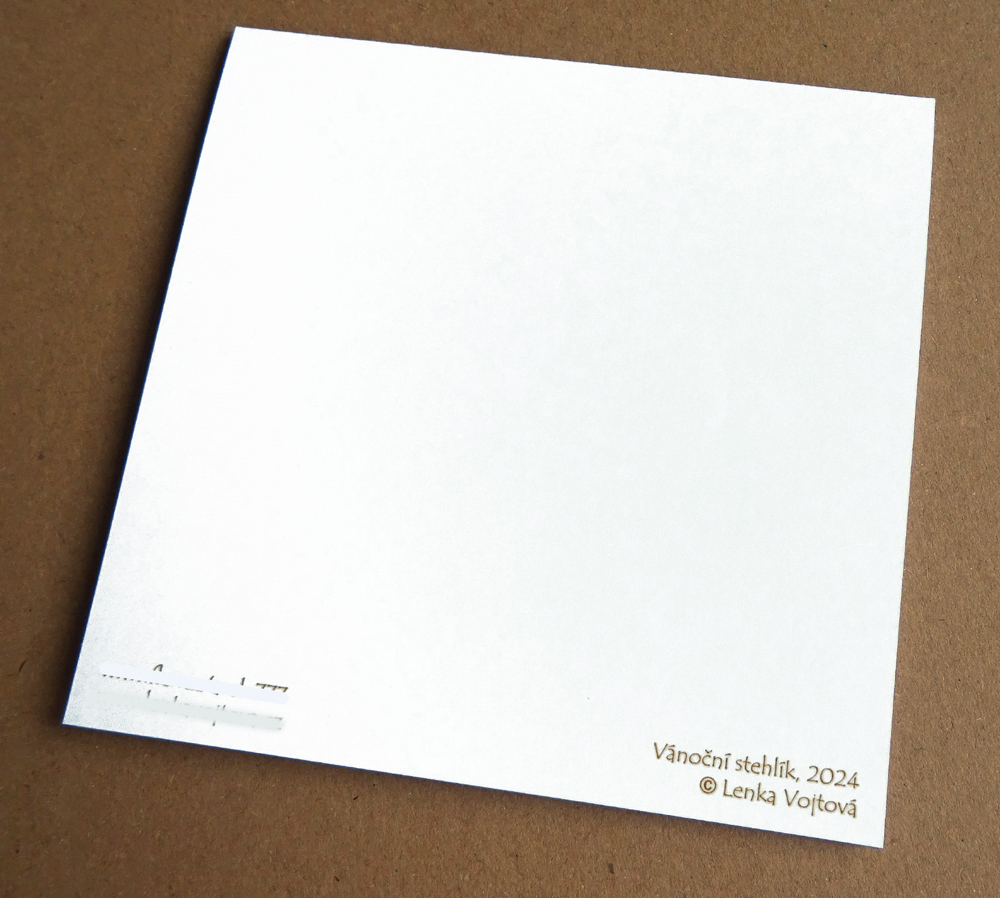 Tištěno na papír s gramáží 300gm2. Rozměr 13 x 13 cm, dvojitá, otevírací karta, uvnitř čistá. Dodáváno s obálkou.