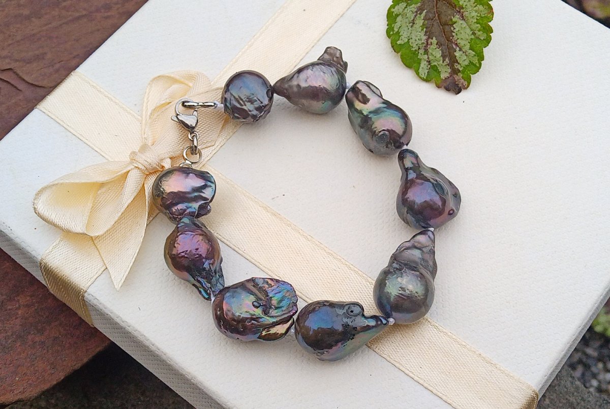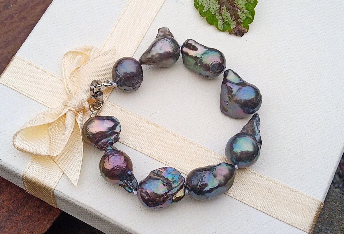 Barokní tahitské mořské tmavé perly o velikosti cca 15-25 mm, s vysokým leskem a s nádhernými duhovými perleťovými odlesky se zapínáním na karabinku z chirurgické oceli - hypoalergenní. Jednotlivé perly jsou od sebe oddělené uzlíky proti vzájemnému odírání a pro lepší ohebnost náramku.