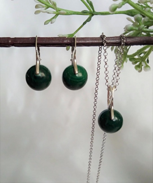 Súprava prívesok a náušnice sú vyrobené z pravého prírodného malachitu kvality AA veľkosti 12 mm.