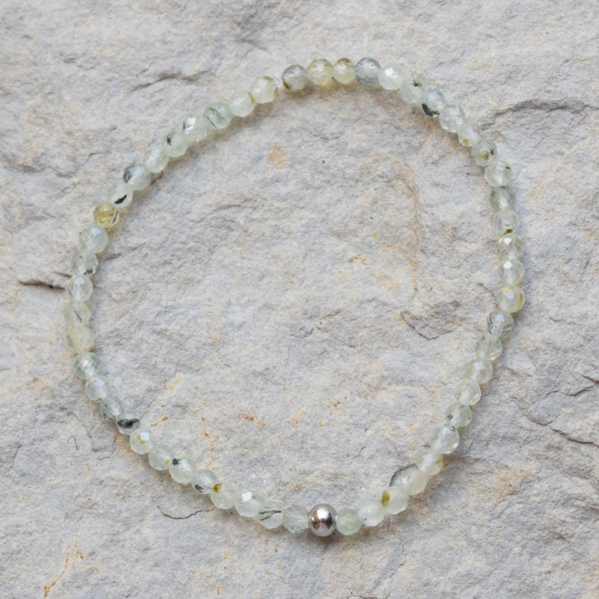 Náramek je vyroben z broušených kuliček prehnitu s turmalínem(3mm). Je cca 17 cm dlouhý navlečený na pruženku. Doplněn komponenty z chirurgické oceli.