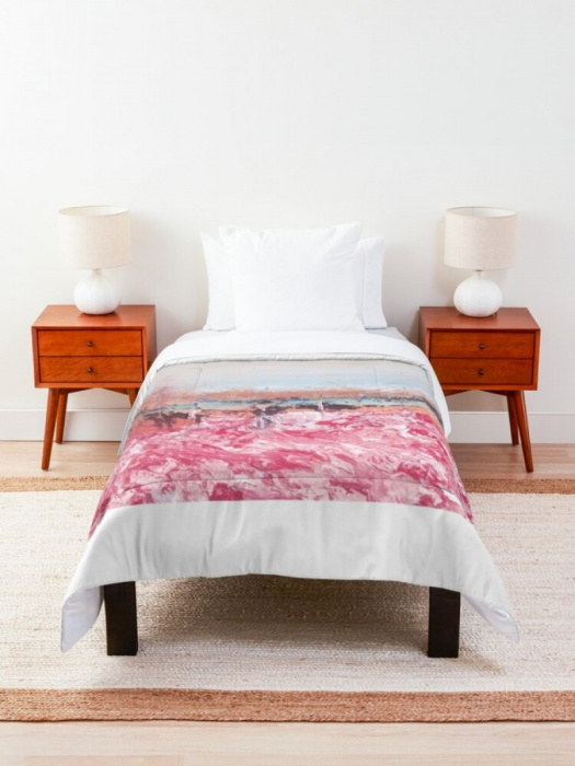 * Přehoz přes postel se živým, plnobarevným potiskem mého autorského obrazu V lese po bitvě bílou barvou na zadní straně
