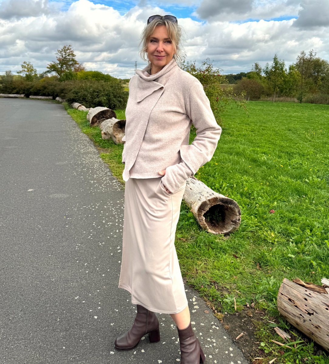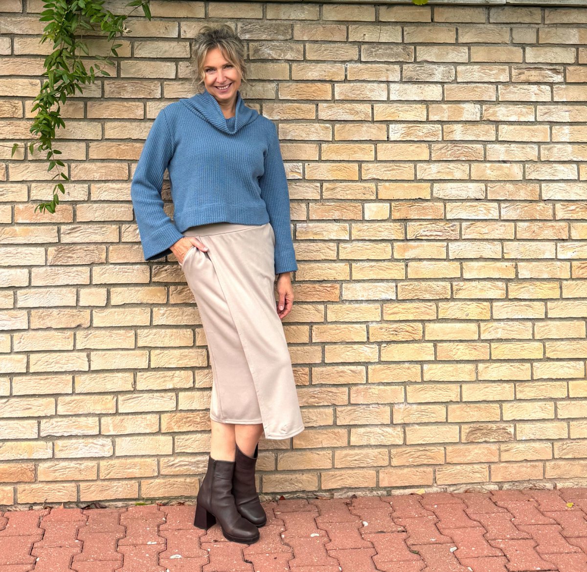 Sukně je ušitá ze směsového středně silného úpletu (68%Vis/28pes/4%ela). Pásek je pružný (vyztužený proti vytažení). Sukně je falešně zavinovací. v bocích jsou vnitřní kapsy.