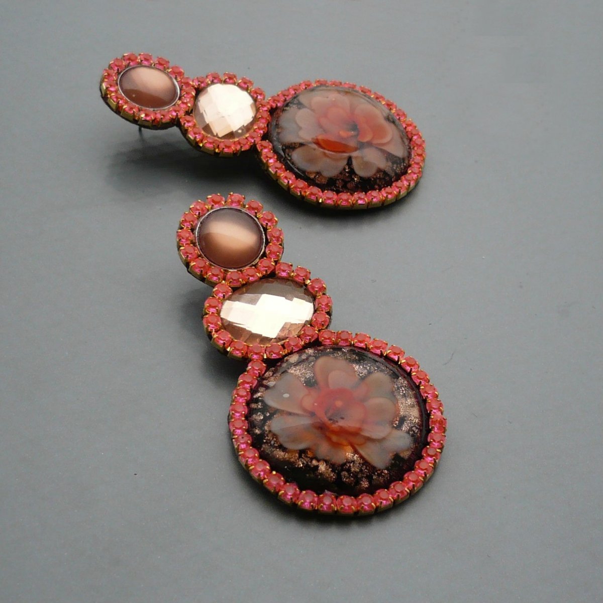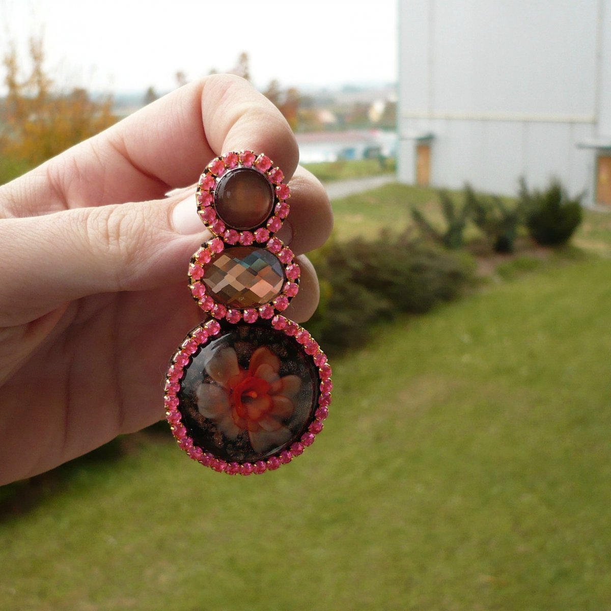 Velké výrazné náušnice z hnědých kamínků a velkého spodního skleněného Murano vinutého kamínku s červeným květem a bronzovým třpytivým zdobením. Všechny kameny jsou obklopené růžovými štrasovými kamínky, které jsou zasazené v kotlíčkách zlaté barvy. Vše je upevněné na textilním podkladu.