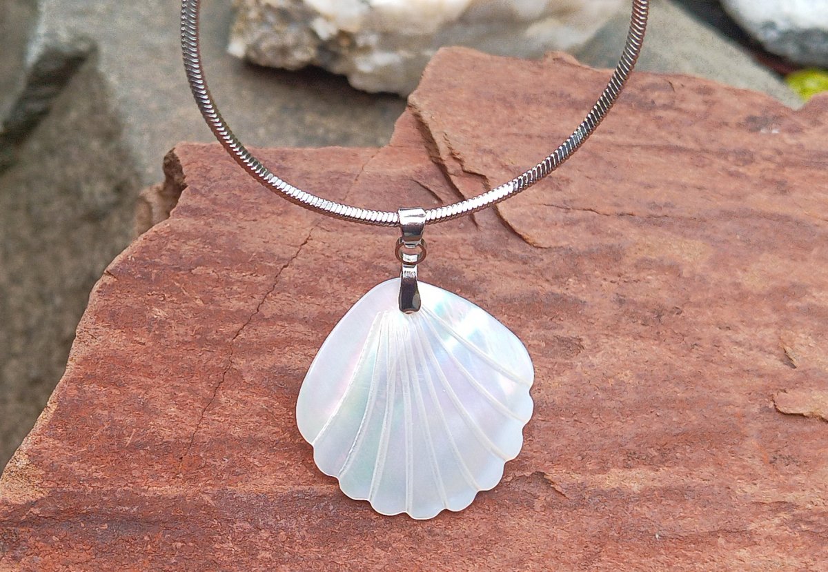 Přírodní vyřezávaná perleť 28x28 mm s úžasnými duhovými perleťovými odlesky zavěšená na hadovitém z chirurgické oceli - hypoalergenní, vhodné i pro alergiky.