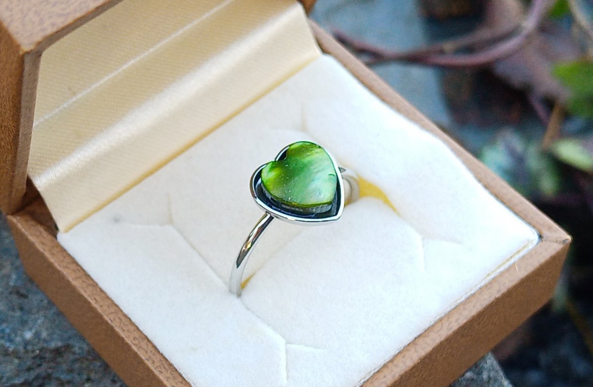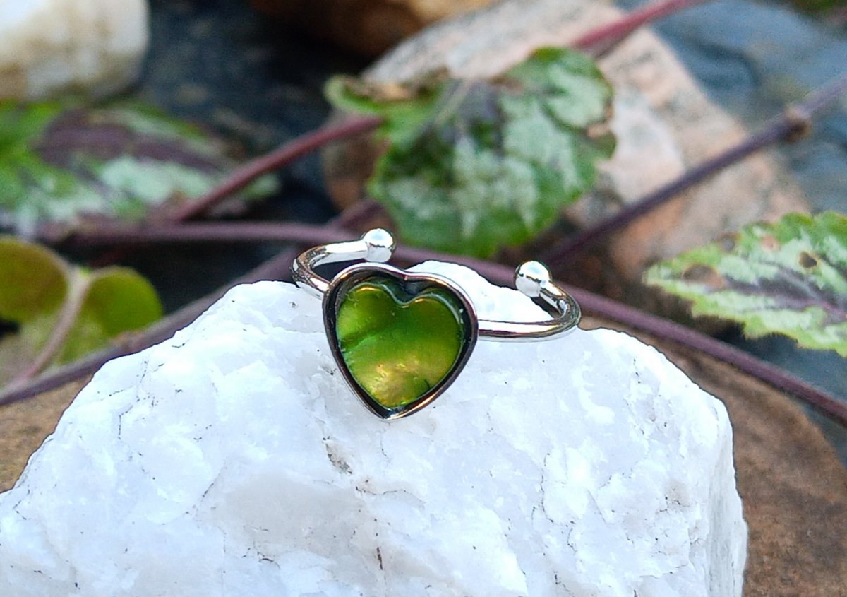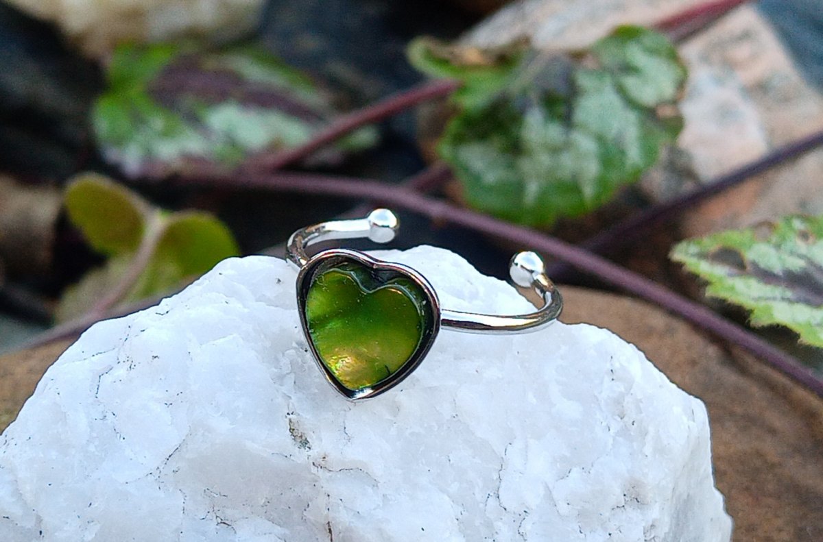 Srdíčko z přírodní dokonale lesklé zelené duhové perletě ❤️ vložené do kroužku v univerzální velikosti z chirurgické oceli, což je hypoalergenní kov - vhodný i pro alergiky.