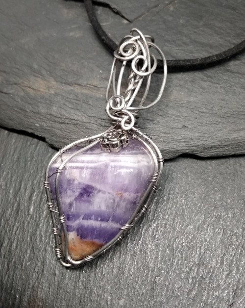 Přívěsek z pěkně zbarveným ametystem je velký 5.5 x 2.5 cm, materiál - nerezová ocel, k přívěsku koženková šňůrka 46 cm dlouhá. Můžu prodloužit.
