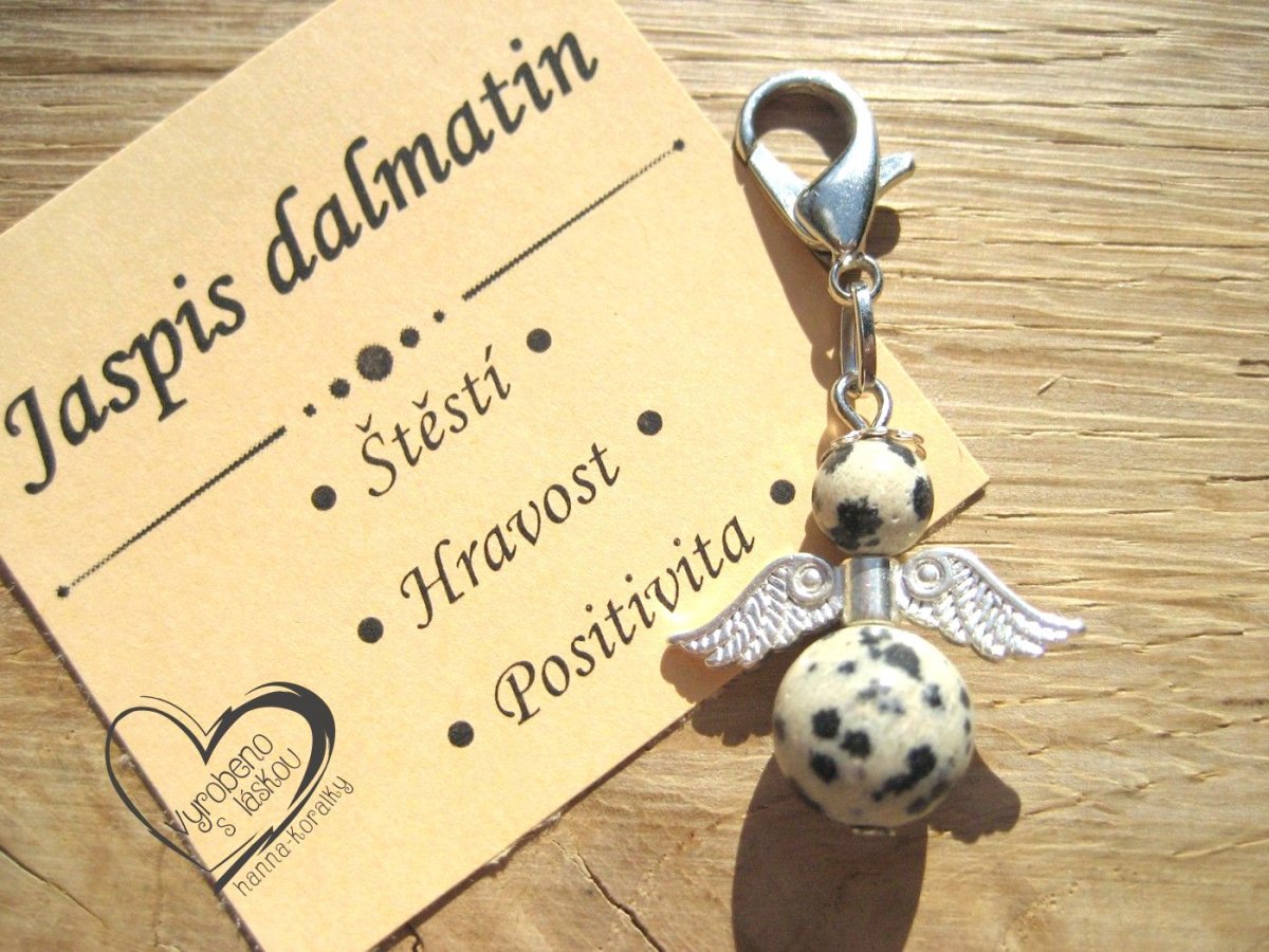 Andělský přívěsek - anděl - andílek - andělíček pro štěstí z minerálu jaspis dalmatin a kovových komponentů, v dárkovém balení s kartičkou - přívěsek na klíče - peněženku nebo jen tak pro radost, velikost přívěsku 4,5cm vč.karabinky