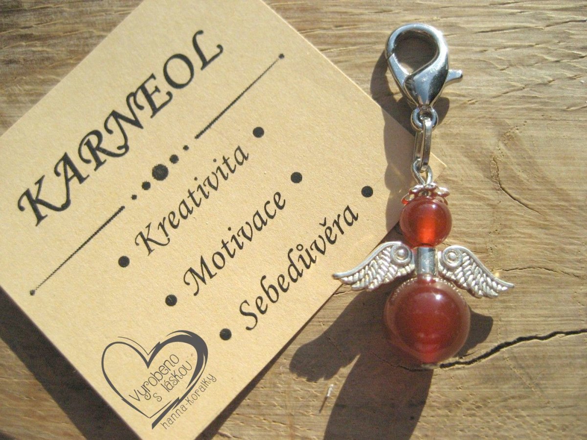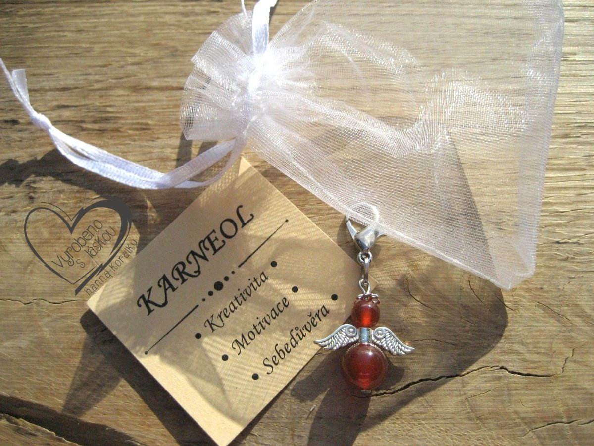 Andělský přívěsek - anděl - andílek - andělíček pro štěstí z minerálu karneol, v dárkovém balení s kartičkou - přívěsek na klíče - peněženku nebo jen tak pro radost, velikost přívěsku 4,5cm vč.karabinky