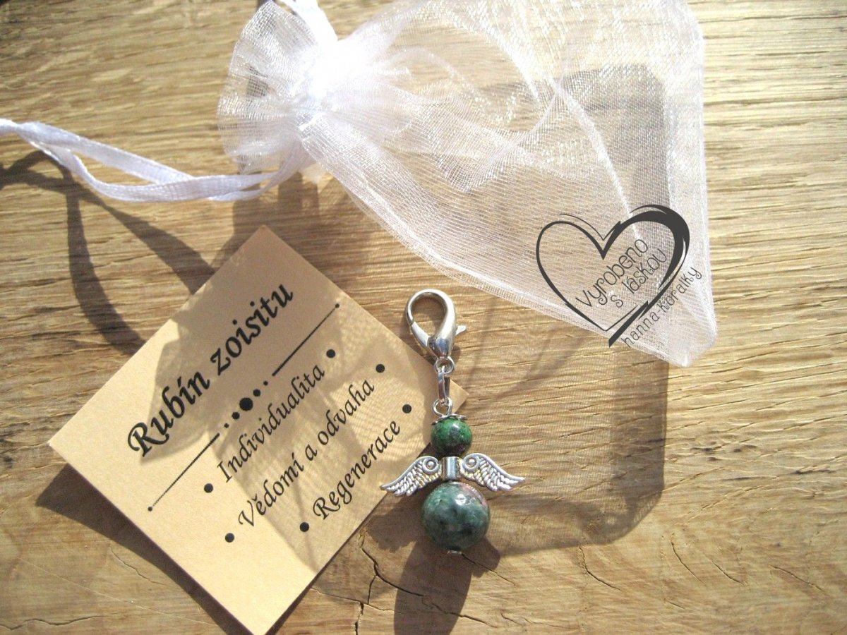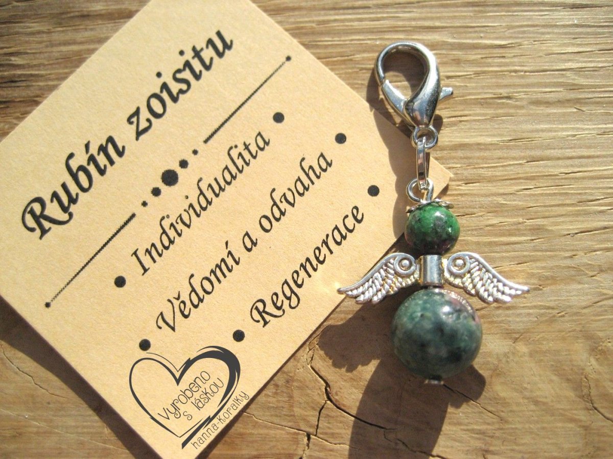 Andělský přívěsek - anděl - andílek - andělíček pro štěstí z minerálu rubín v zoisitu, v dárkovém balení s kartičkou - přívěsek na klíče - peněženku nebo jen tak pro radost, velikost přívěsku 4,5cm vč.karabinky