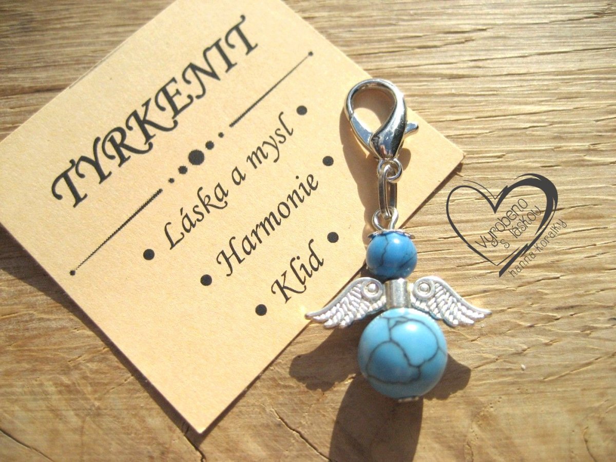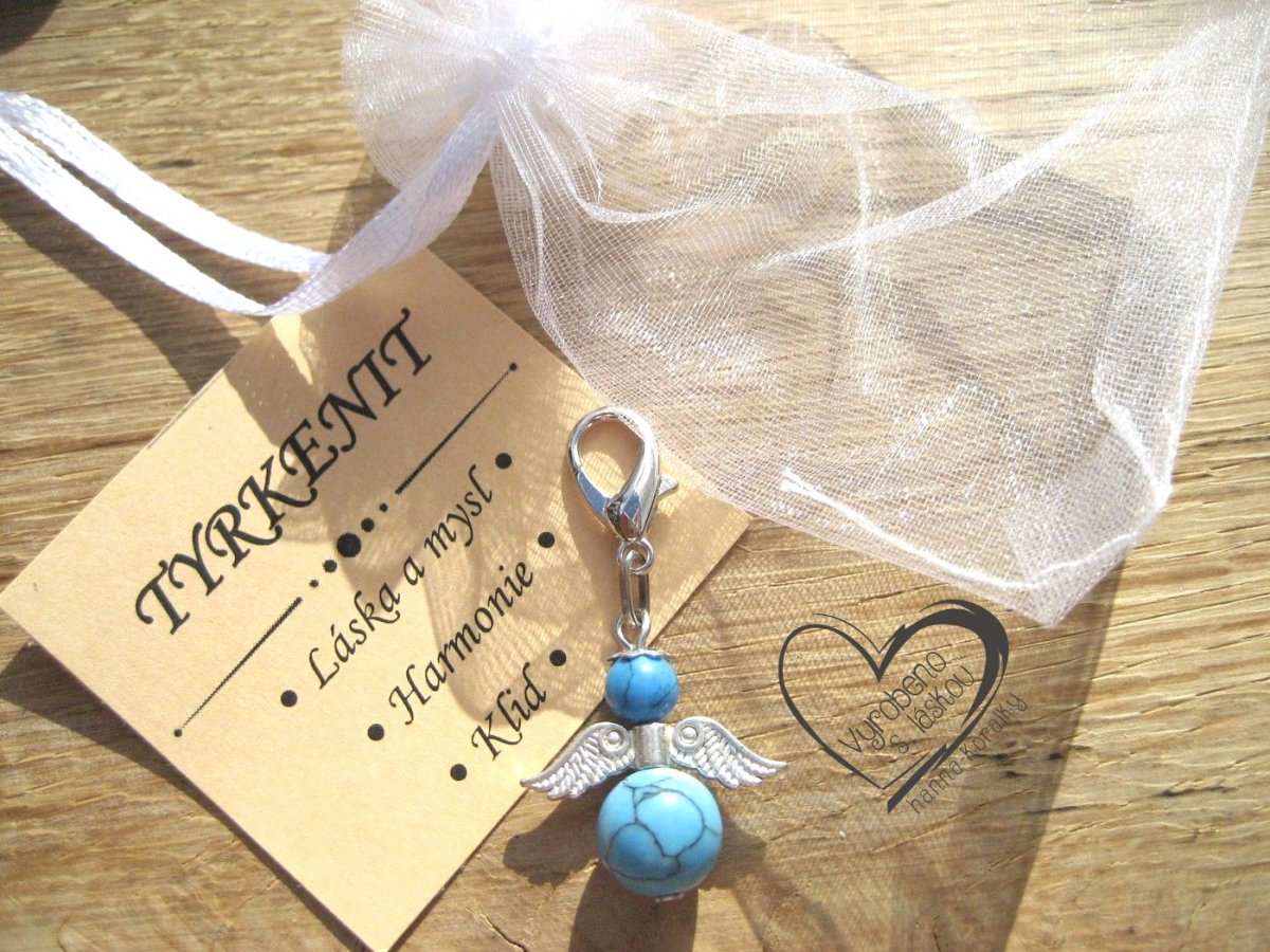 Andělský přívěsek - anděl - andílek - andělíček pro štěstí z minerálu tyrkenit, v dárkovém balení s kartičkou - přívěsek na klíče - peněženku nebo jen tak pro radost, velikost přívěsku 4,5cm vč.karabinky