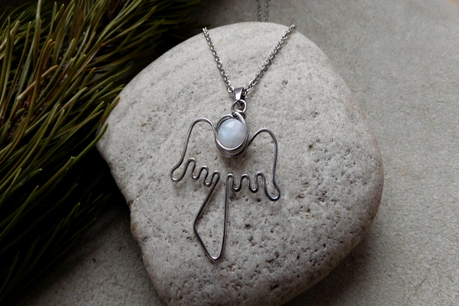 Nový druh andílka z chirurgické oceli., hlavička je kulička měsíčního kamene............tepaný.