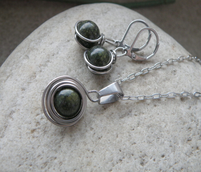 Ručně vyrobený měděný přívěšek z kuličky zelenkavého serpentinu, vel, kamene 8 mm, zavěšeno na měděném řetízku, není v ceně, možno přikoupit. Nebo také kůži, obruč....