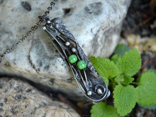 Autorský přívěsek vytvořený technikou cínování z bezolovnatého cínu, měděných drátů a měděného plechu. Přívěsek doplňují zelené porcelánové korálky a je zavěšen na černém řetízku o délce 50 cm se zapínáním na karabinku.