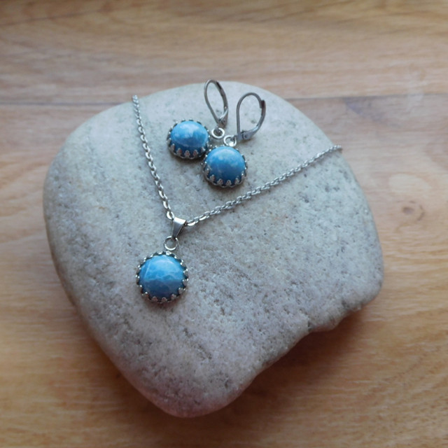 Náhrdelník z chirurgické oceli, zdobí je krásný larimar.Ozdobné lůžko.
