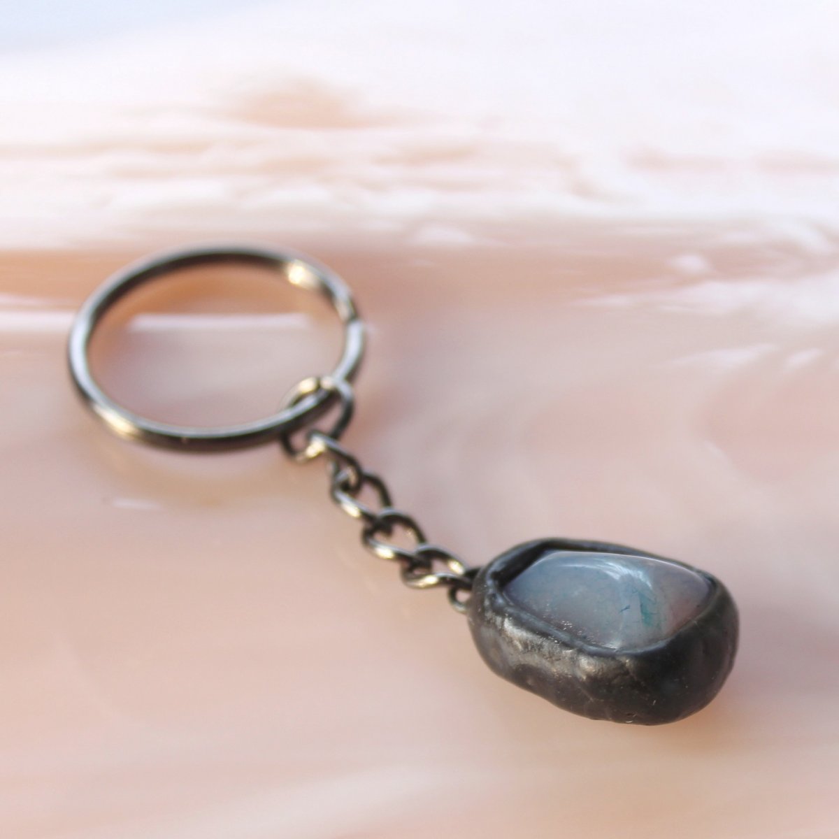 Přívěsek na klíče je zhotoven z tromlovaného kamínku a kovových kompenentů technikou tiffany (cínování, měkké pájení). Celá klíčenka je dlouhá 7cm. Přívěsek je patinován a ošetřen antioxidantem.