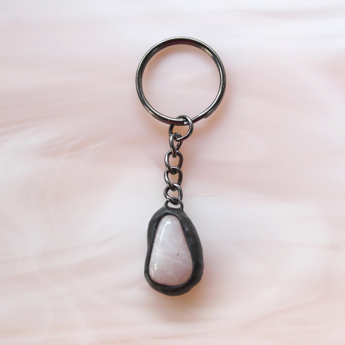 Přívěsek na klíče je zhotoven z tromlovaného kamínku a kovových kompenentů technikou tiffany (cínování, měkké pájení). Celá klíčenka je dlouhá 7,3cm. Přívěsek je patinován a ošetřen antioxidantem.