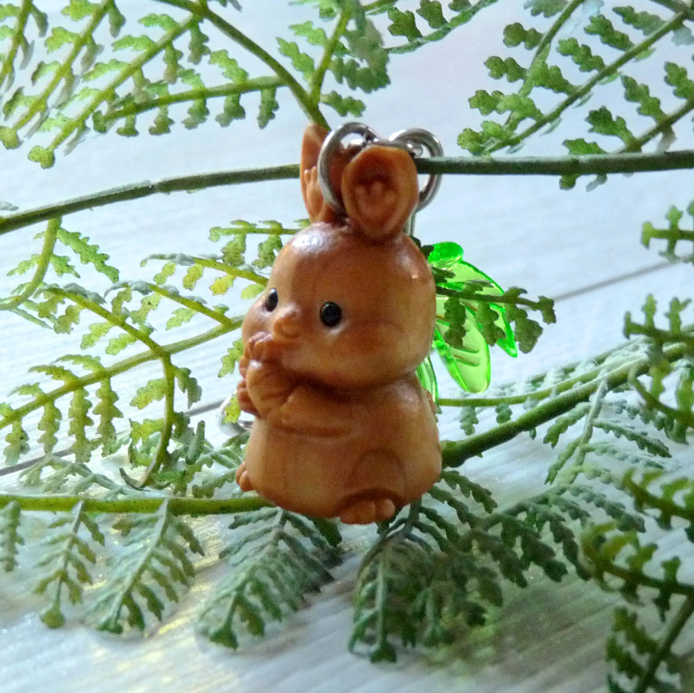 Králíček je připevněný na krátký řetízek ozdobený velkými zelenými listy