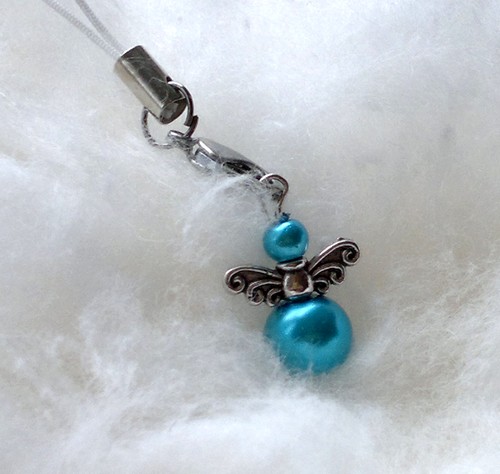 Andílek je vyrobený z tyrkysových skleněných perliček a komponentu křídel, zavěšený na karabince s bílou šňůrkou.