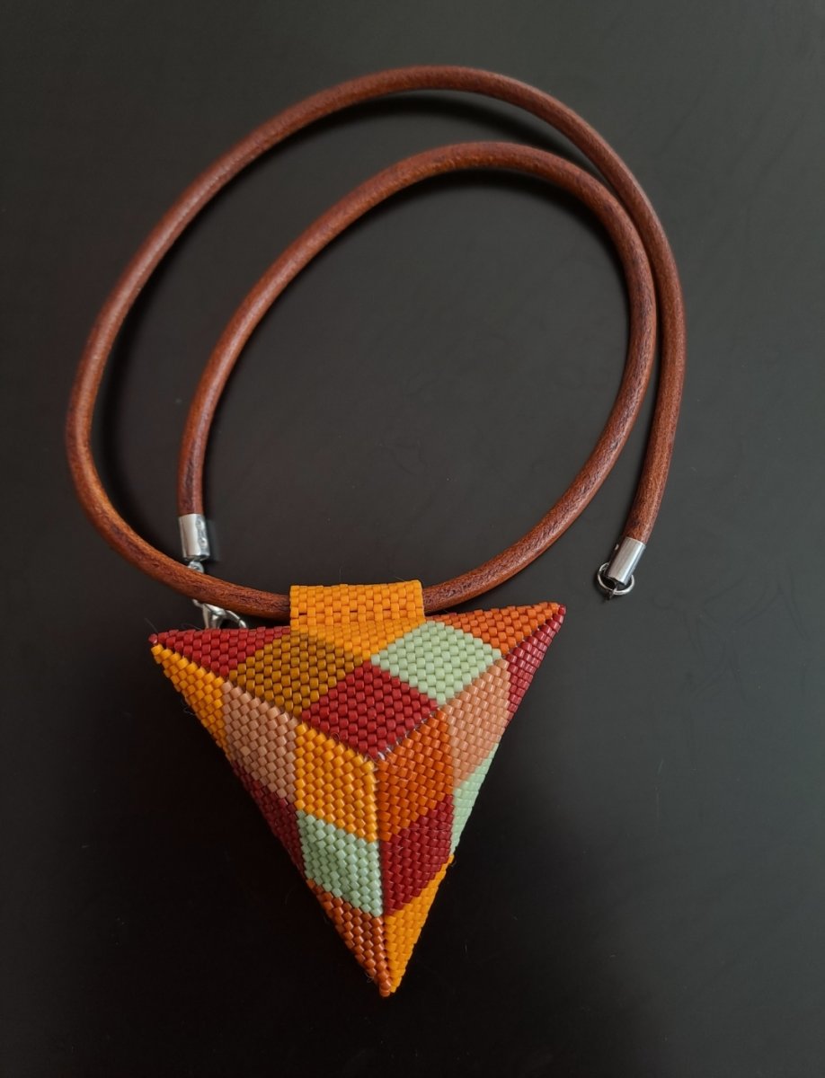 Přívěsek trojúhelník ušitý z japonských korálků Myiuki delica. Zavěšený na kozenem závěsu se zapínáním.