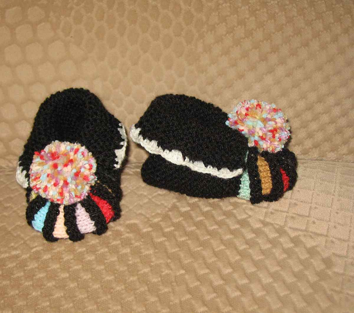 Základní barvou je barva černá a proužky na přední části jsou různobarevné stejně jako bambule. Obháčkování nahoře je bílé. Lze uplést v jakémkoliv barevném provedení na přání - dodací lhůta se prodlouží o 2dny.