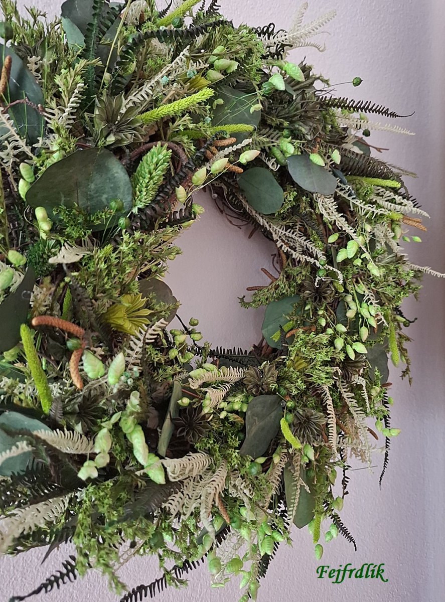 Velký vázaný, přírodní věnec o průměru 50 cm, ovázaný březovými větvičkami , stabilizovaným eukalyptem, stabiliz.kapradím dvou barev, třesavou trávou , sušeným lnem..na slaměný korpus.