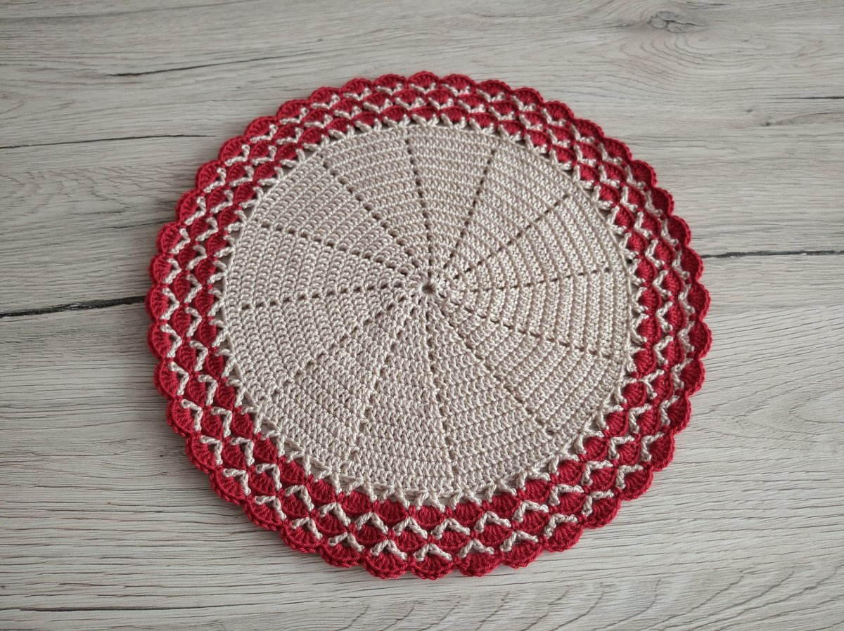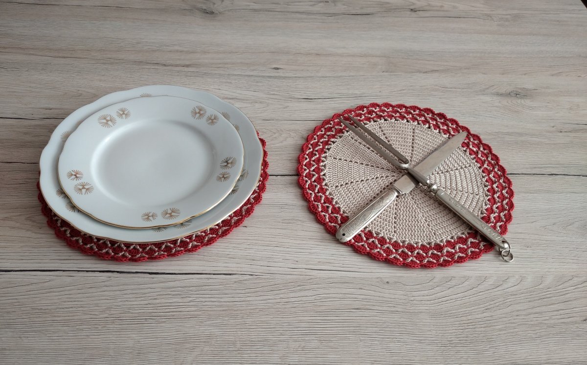 Háčkované prostírání nebo podložky pod květiny, ozdoby, vázy či cokoliv. Béžová s korálově červenou jsou krásná kombinace. Působí i vánočně.