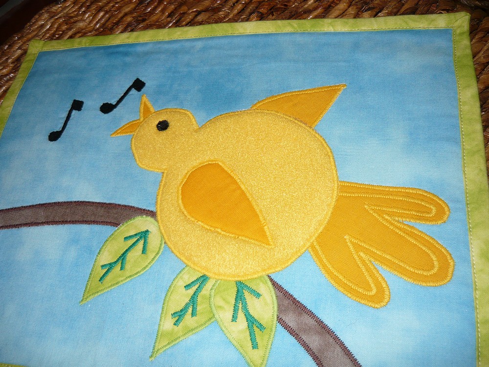 Prostírání, nebo ozdoba na stůl s aplikací ptáčků spojené se strojovou výšivkou žížaly a not