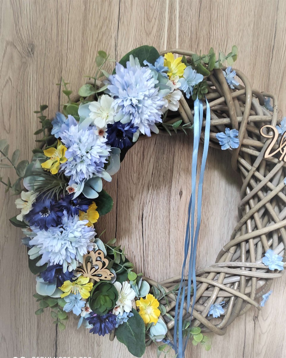 Krásný proutěný věnec v modrém ladění na zavěšení na stěnu nebo na dveře, větší velikosti, průměr cca 43 cm. Je ozdoben umělými textilními květy a listy, přízdobami a modrou stuhou.