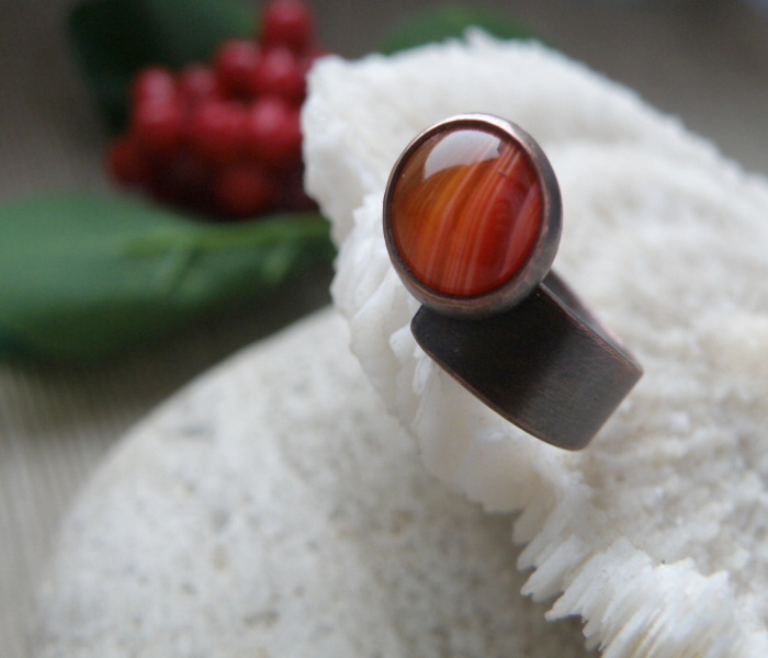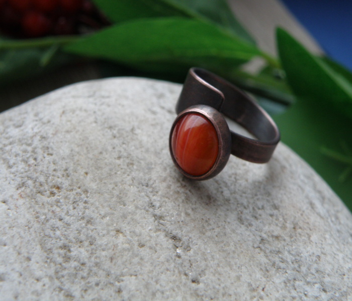 Měděný prsten se vsazeným krásným achátem , vel. nastavitelná.
