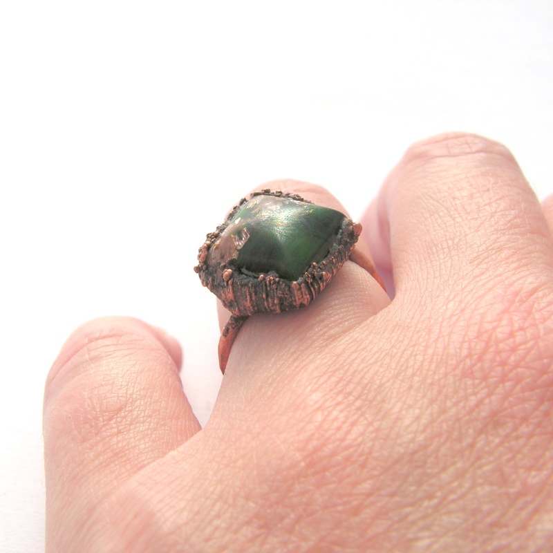 Tento šperk vznikl spojením přírody a alchymie. Starodávné kameny a moderní technologie. Šperk vzniká pomalu, vrstva po vrstvě, v procesu trvajícím několik dní. Nesmí se uspěchat. Měď se usazuje jako krystalizující energie – tichá, přesná, magická. Výsledkem je jedinečný artefakt – pevný, a přitom nese křehkost a jemnost původního materiálu.