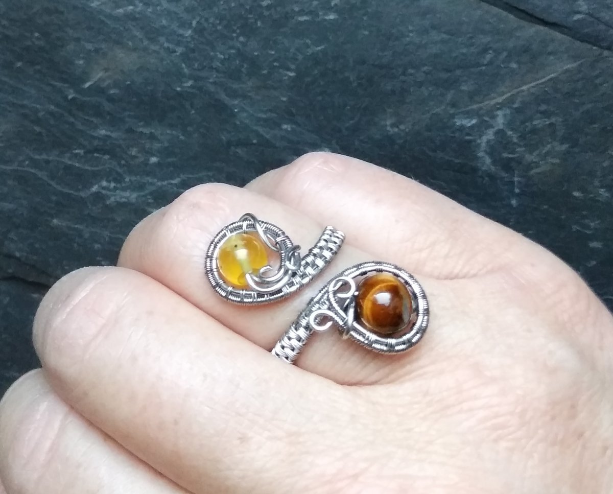 Nabízím nový prsten roztahovací s korálky minerálů - tygřím okem a citrónovým nefritem. Výchozí průměr je 18 mm, velikost přední strany 3 cm. Vyroben je z nerezové stálobarevné oceli.