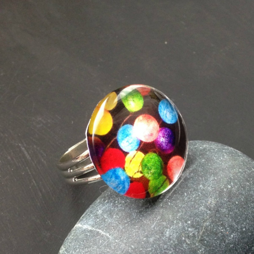 Prstýnek v barvě platiny se skleněným kabošonem a grafickým motivem. Kabošon má průměr 20 mm, prstýnek má nastavitelnou velikost