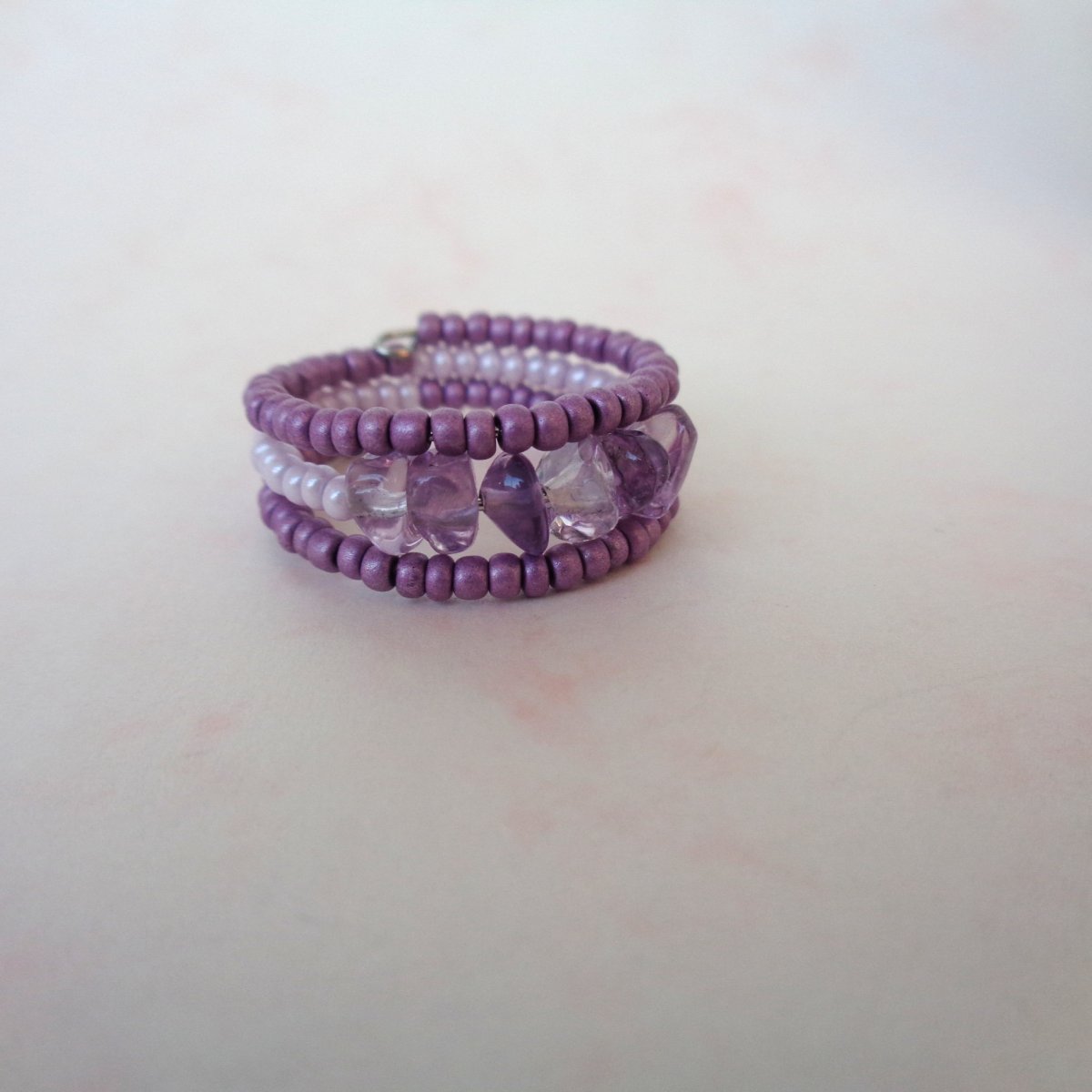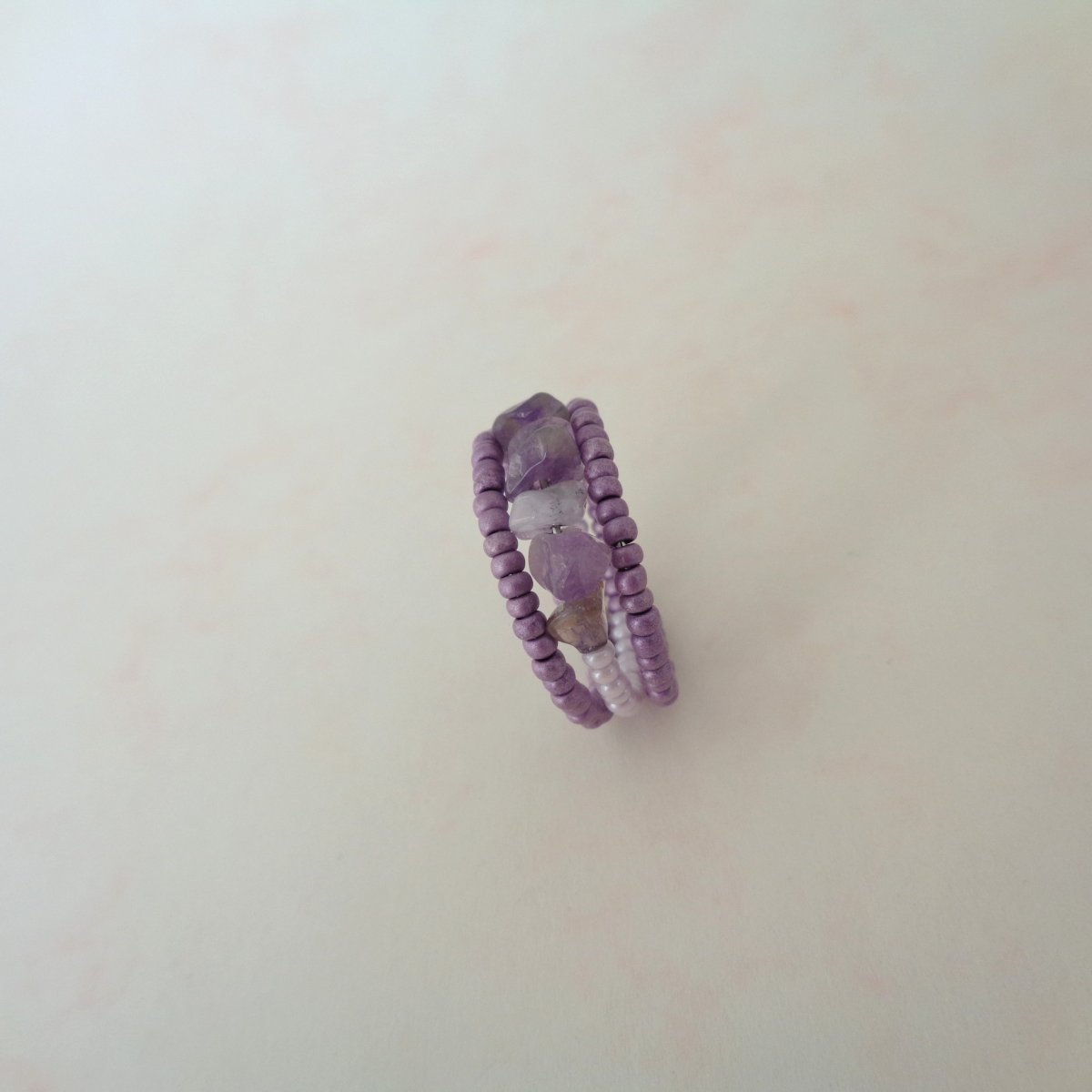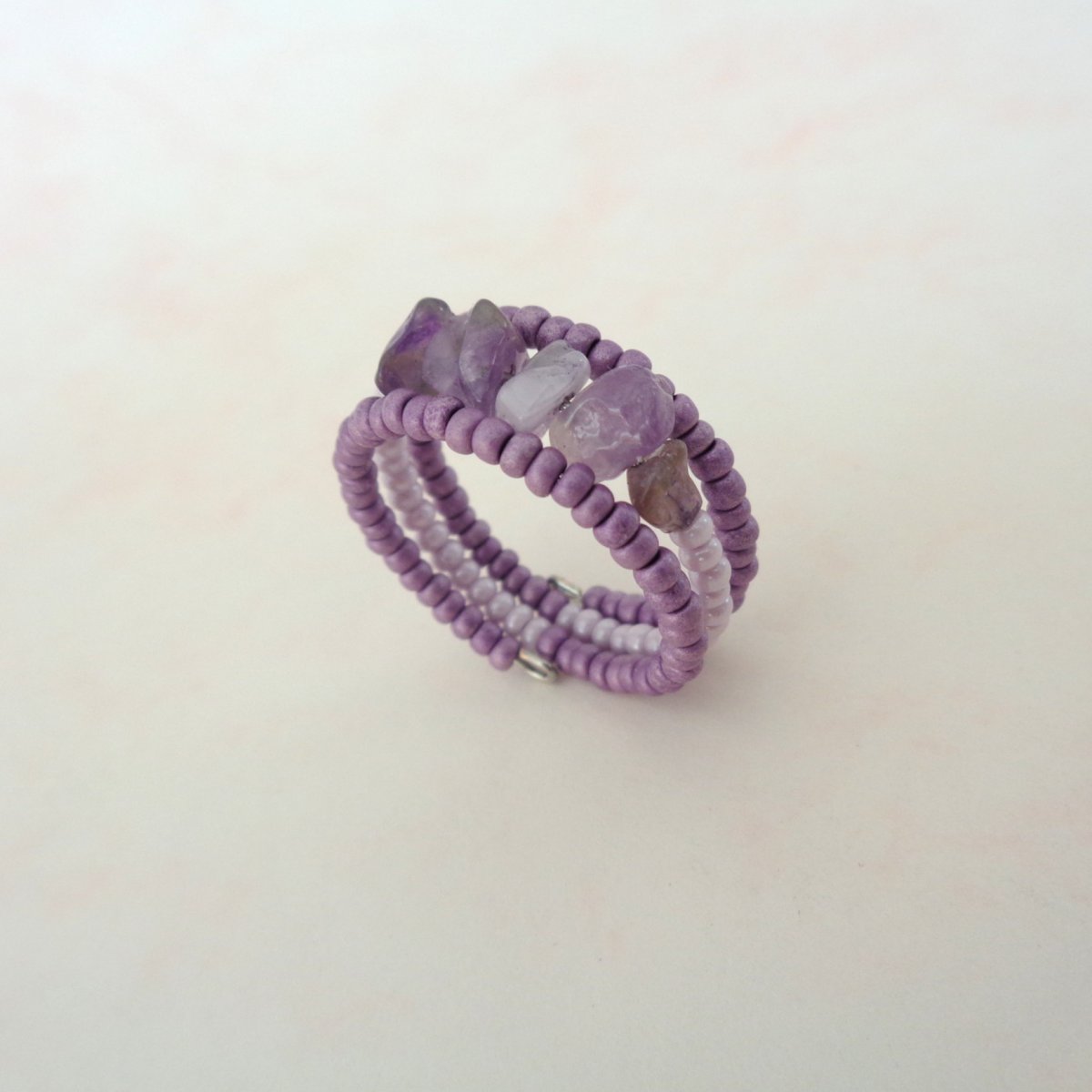 Prstýnek z rokajlu fialové a levandulové barvy a minerálu - ametyst. Vše na třech otočkách paměťového drátku.