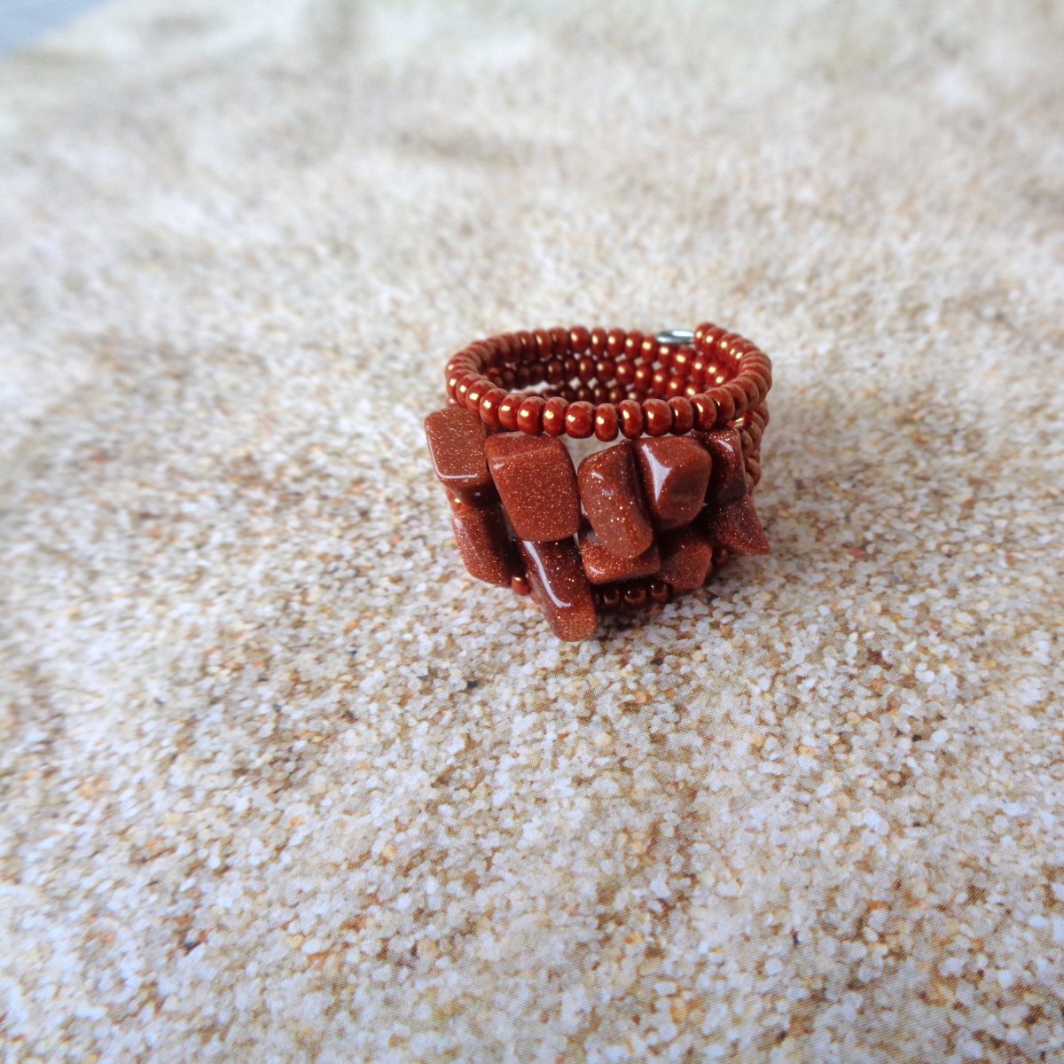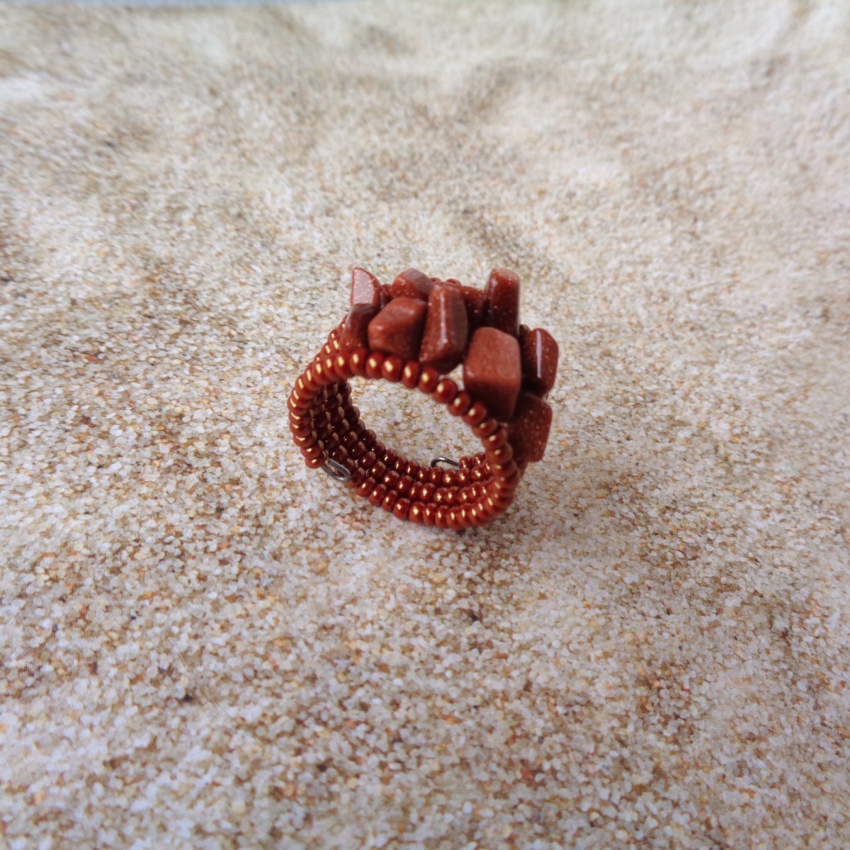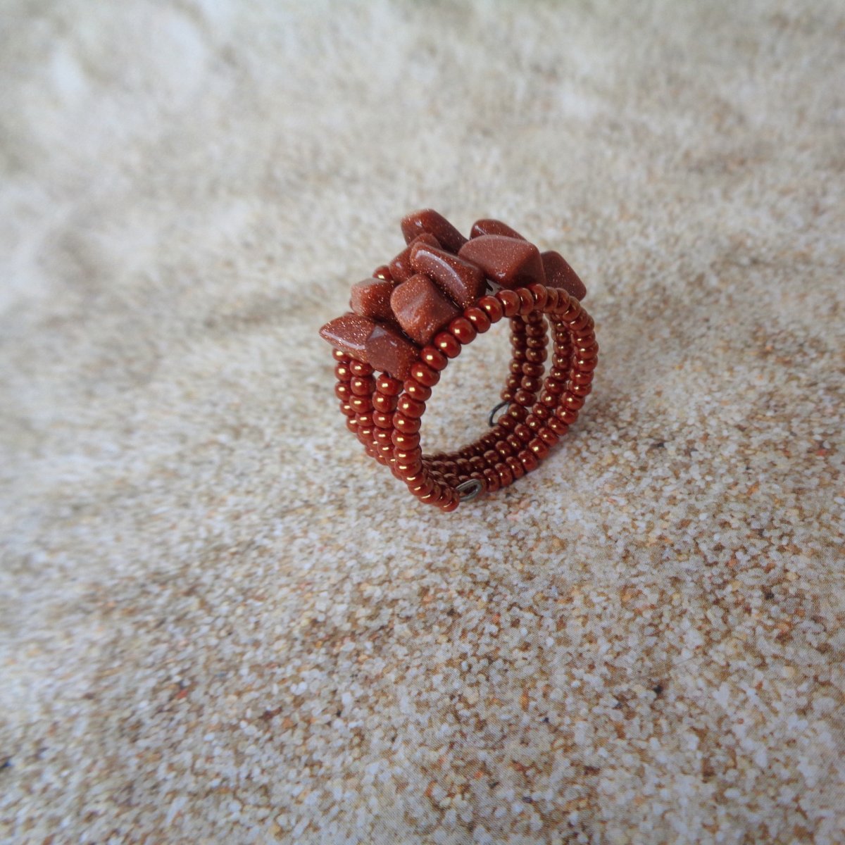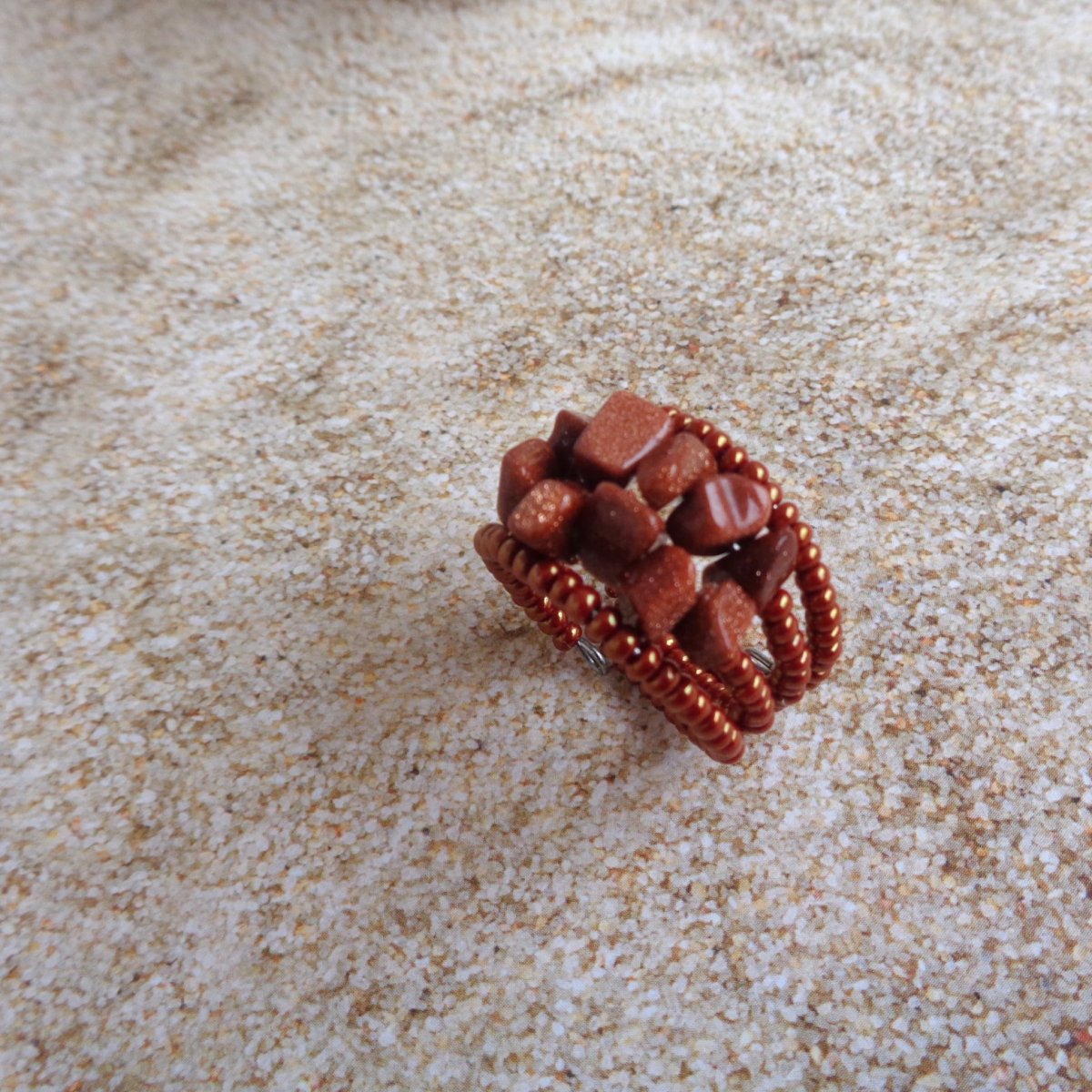 Prstýnek z rokajlu rezavé (měděné) barvy a minerálu - avanturín. Vše na čtyřech otočkách paměťového drátku.