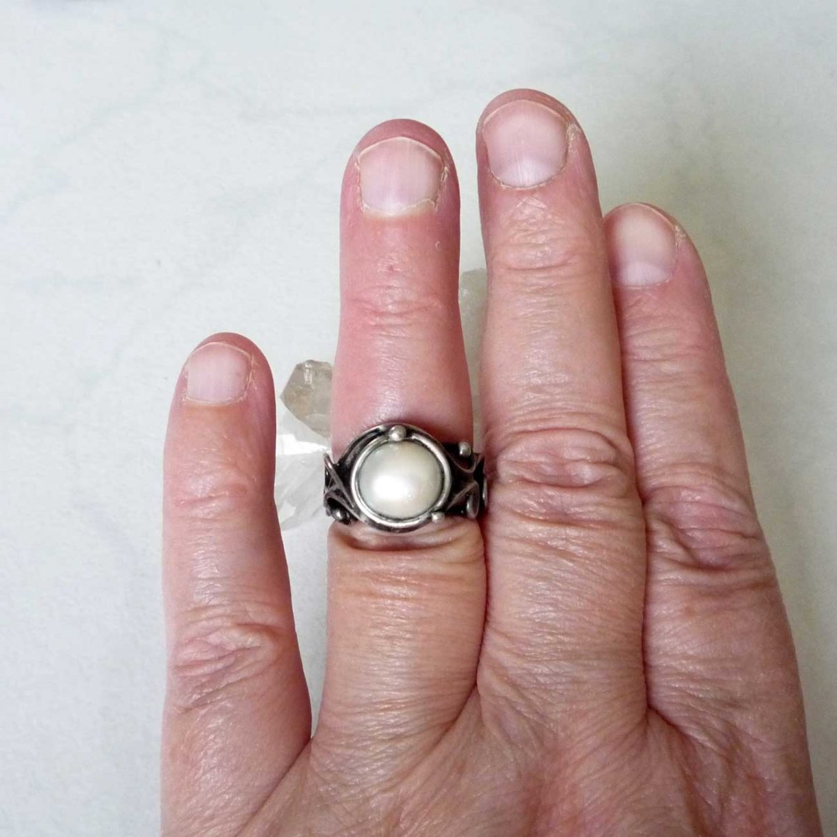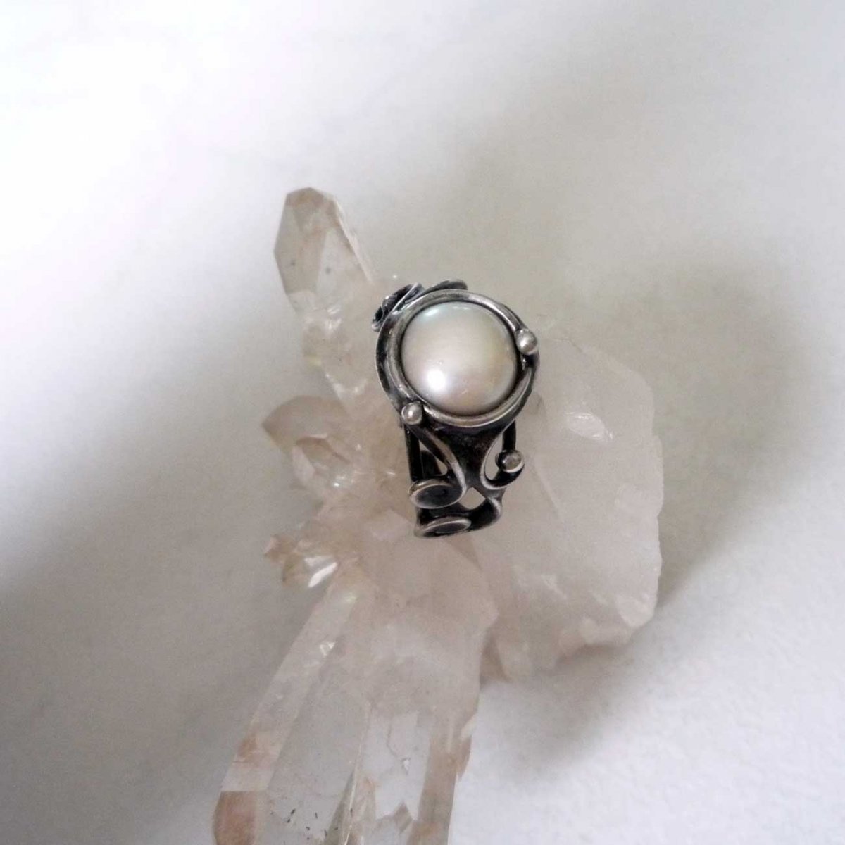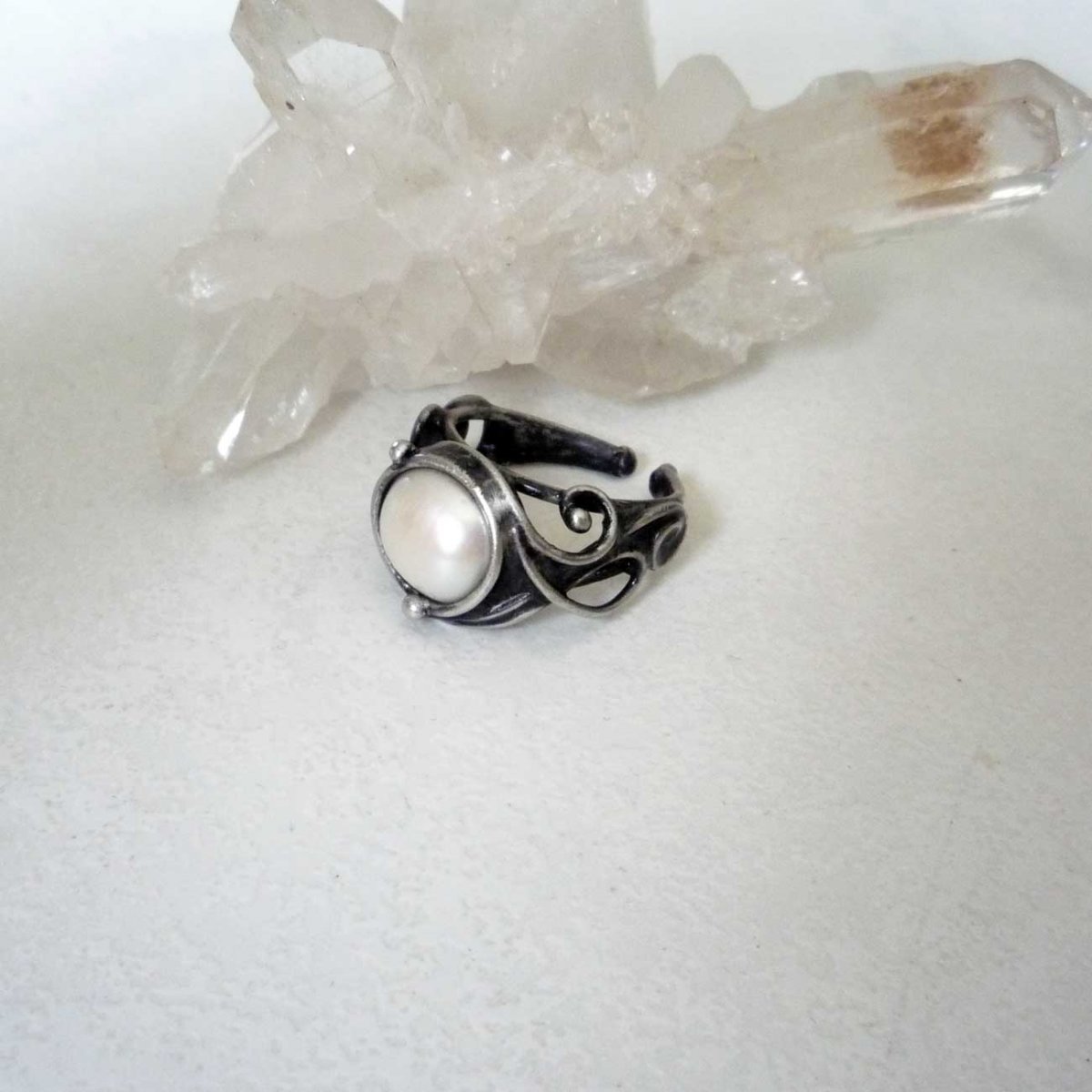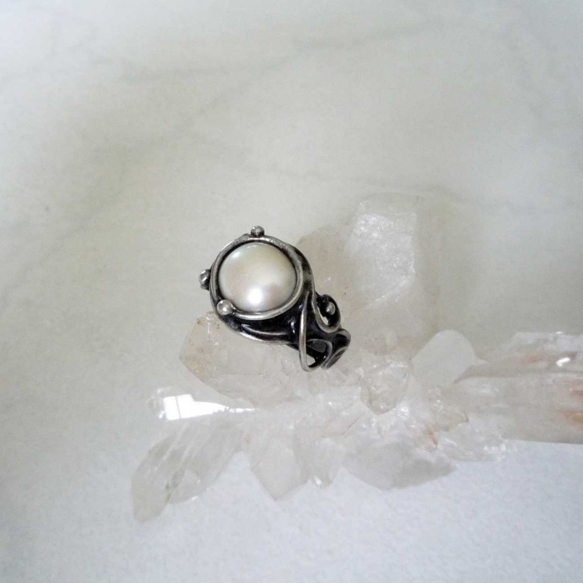 Autorský prstýnek zhotoven z bezolovnatého cínu se stříbrem, perly a drátu.