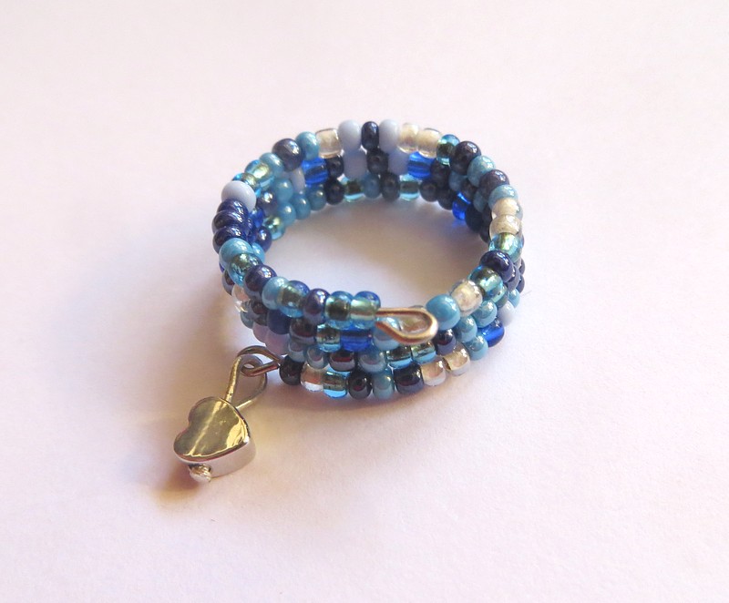 Prstýnek na paměťovém drátu s mixem rokajlu a kovovým přívěskem. Průměr otoček je 2 cm.