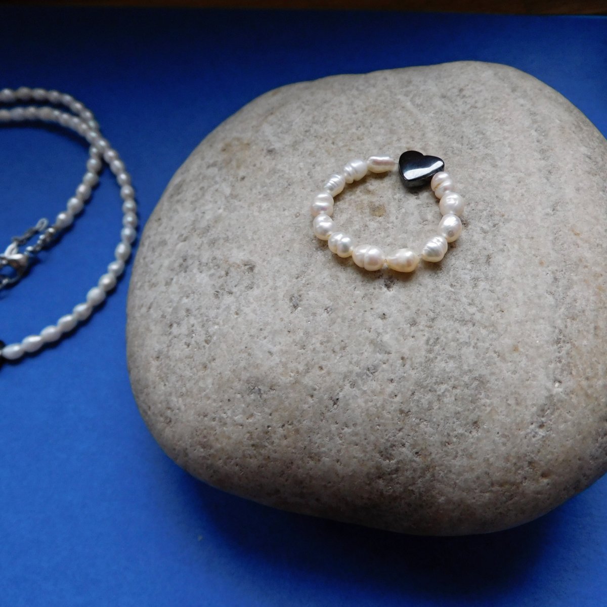 Jednoduchý prstýnek vyrobený z malinkých pravých perliček a hematitového srdíčka.