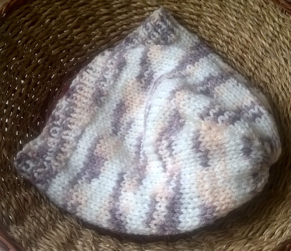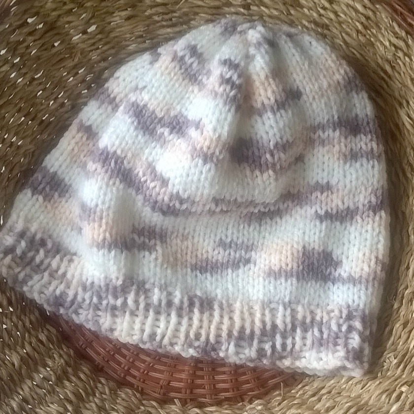 Ručně pletená čepice, lícový žerzej s pružným lemem, pruhy přírodní bílé s hnědobéžovou melírovanou, materiál akryl.